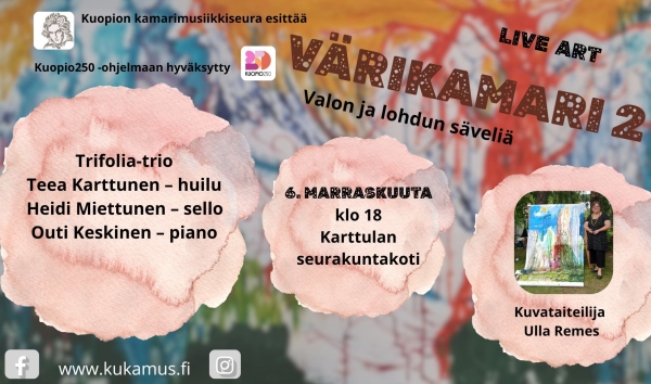 Viimeisen kerran Kuopion juhlavuoden kunniaksi Kuopio250 -ohjelmaan hyväksytty Värikamari 2 -kiertueen live art -tapahtuma soi Karttulassa teemalla Valon ja lohdun säveliä – ranskalaisen musiikin äärellä.